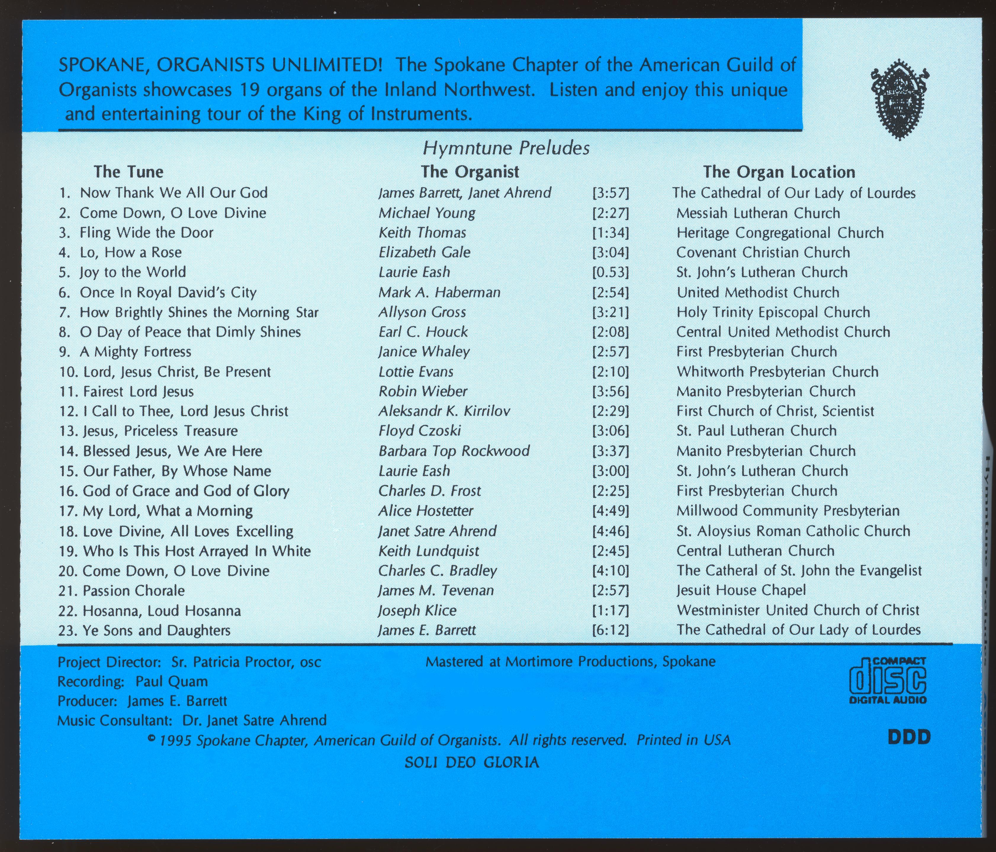 Our chapter is proud of our recording project, Spokane Organists Unlimited, completed in 1995. The recording is available on cassette or CD and features 21 of our members playing 19 organs in the Inland Northwest. All 'profits' go toward our Scholarship Fund.